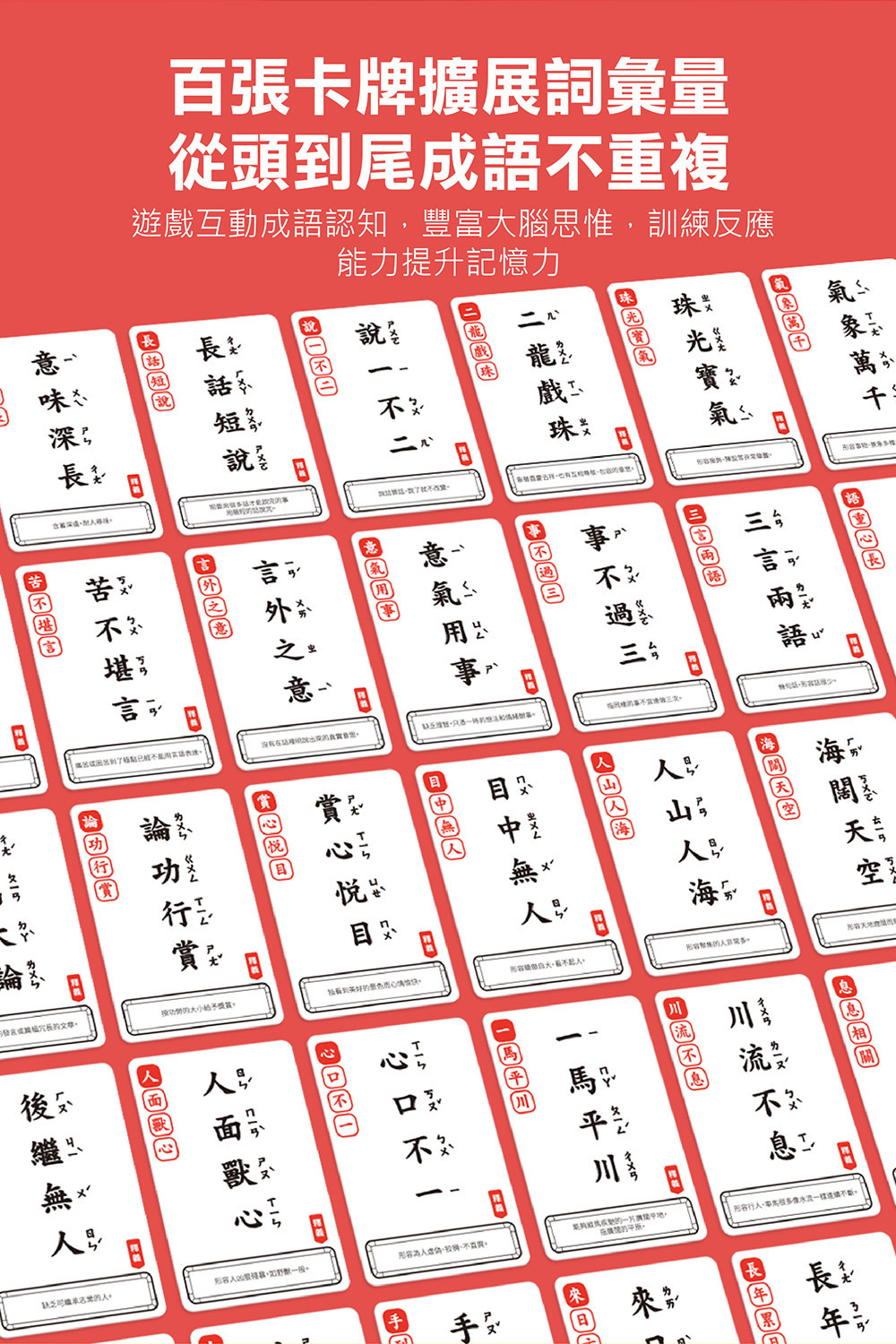 成語接龍卡不僅能夠讓孩子學習成語及解釋,同時也能夠在遊戲中學習,增加詞彙量!同時也可以豐富大腦思惟,訓練反應能力與提升記憶,增強學習效果,在遊戲中學習,強化對於成語的認知與奠定語文基礎。