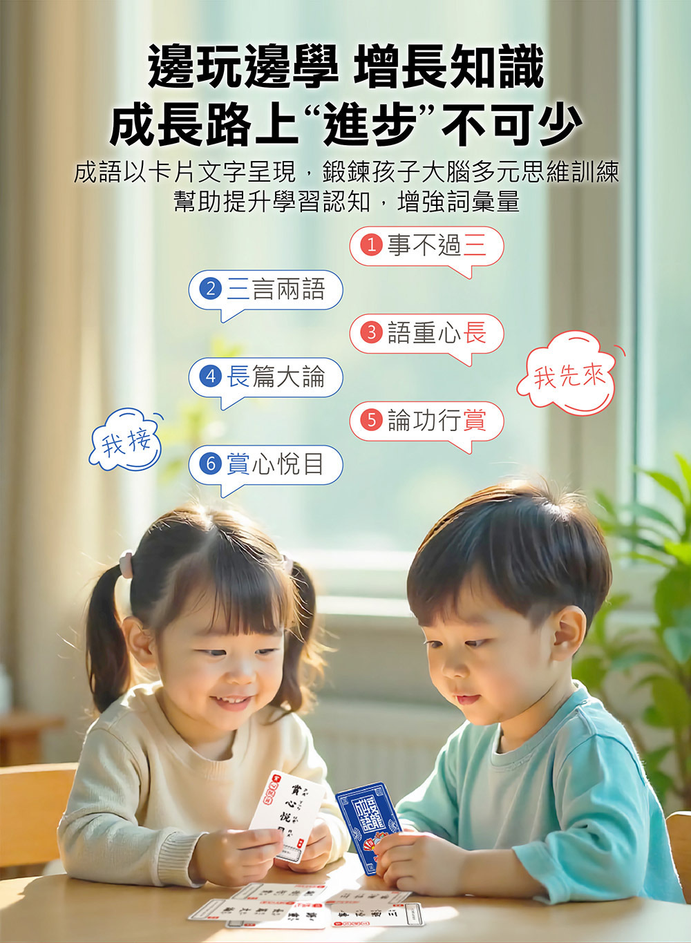 在抓握、拿取成語接龍卡,並思考可接龍的成語時,能促進孩子的手眼協調,並強化腦力開發。
