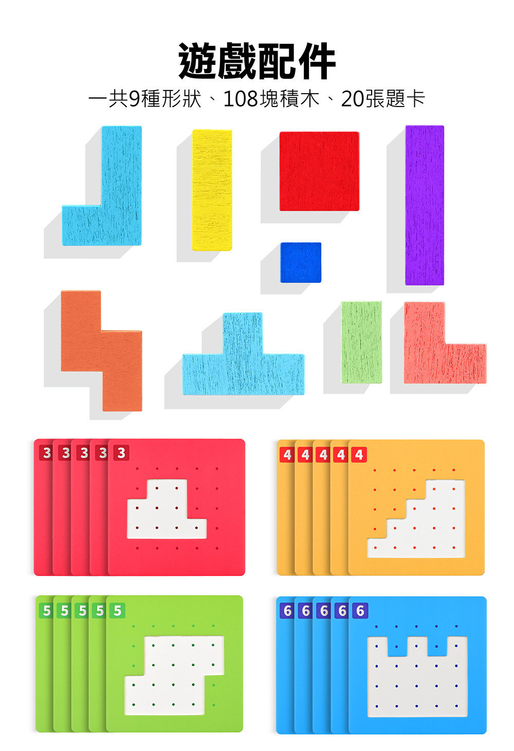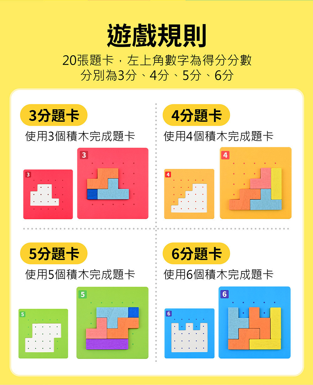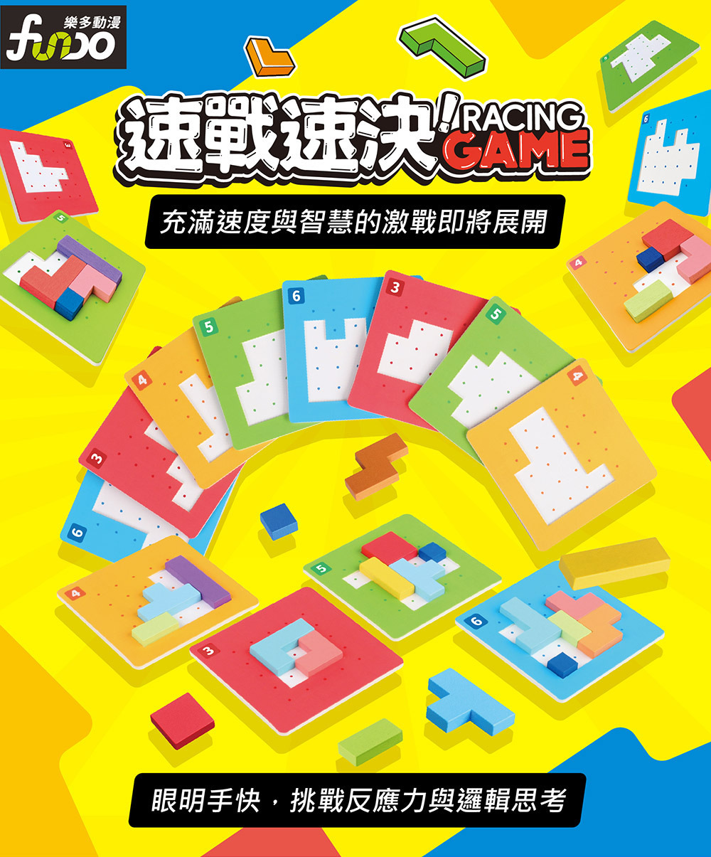 內含多種關卡難度的題卡,搭配色彩繽紛的積木拼圖,玩家需根據卡片提示,快速拼出正 確形狀,考驗速度、準確度與邏輯判斷力。遊戲方式簡單上手,但越玩越刺激,隨著等級提升,孩子的專注力與空間概念也同步成長。快來挑戰誰才是真正的拼圖王者!