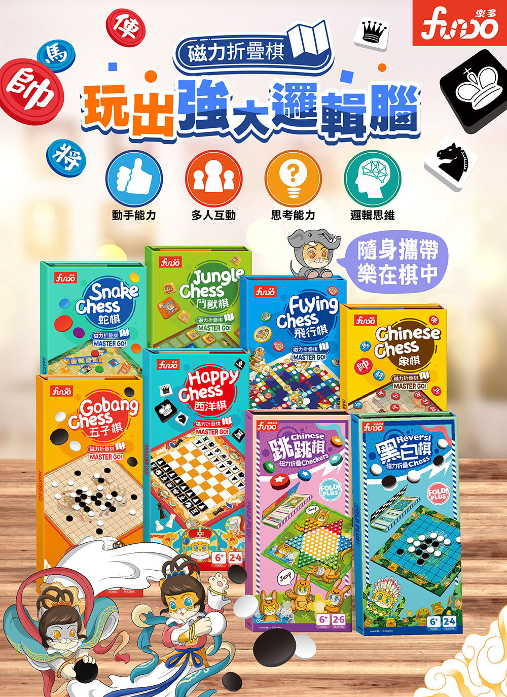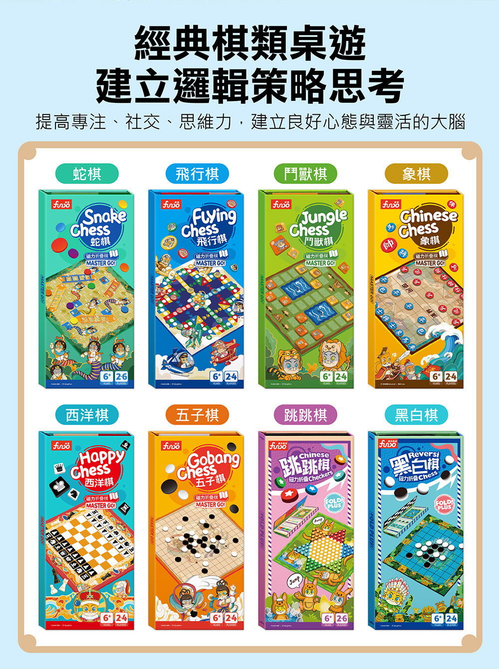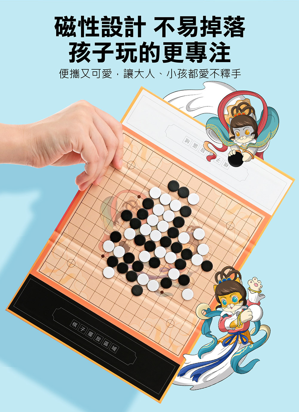 本產品帶有磁性,可以攤開三折的折疊棋盤,並使用內附的棋子,即可直接在上面玩經典的桌遊棋!有趣、便攜又可愛的棋子,讓大人、小孩都愛不釋手,可在遊戲中增進社交、溝通、邏輯、策略等技巧,建立良好心態與靈活的大腦。