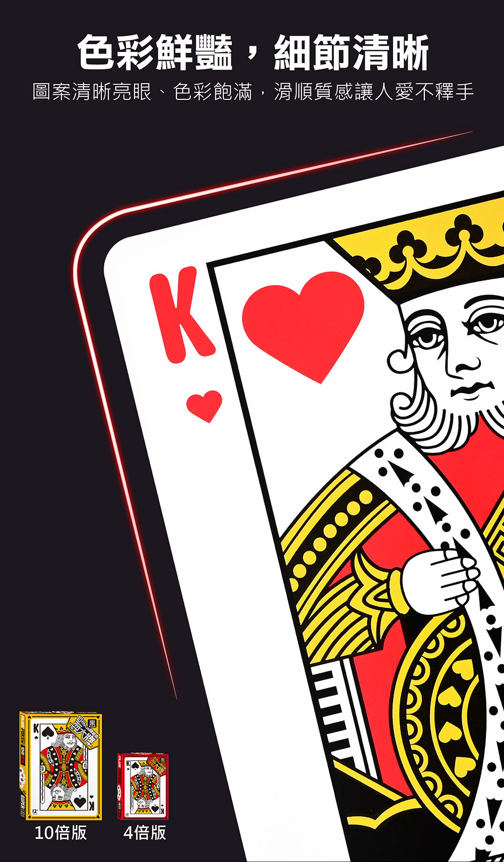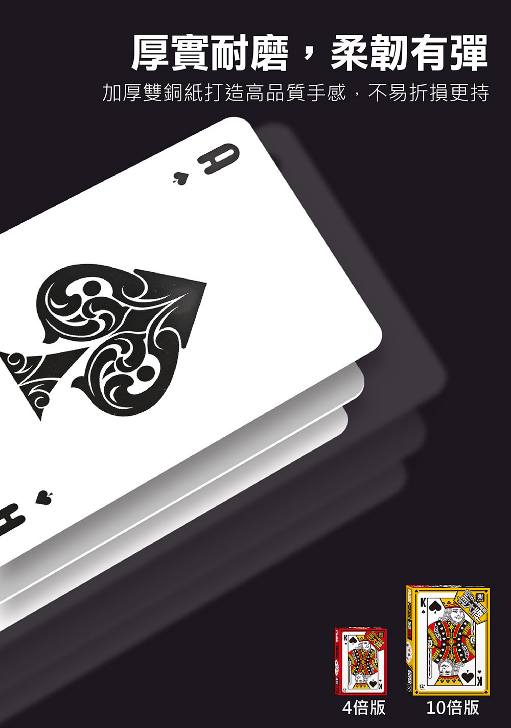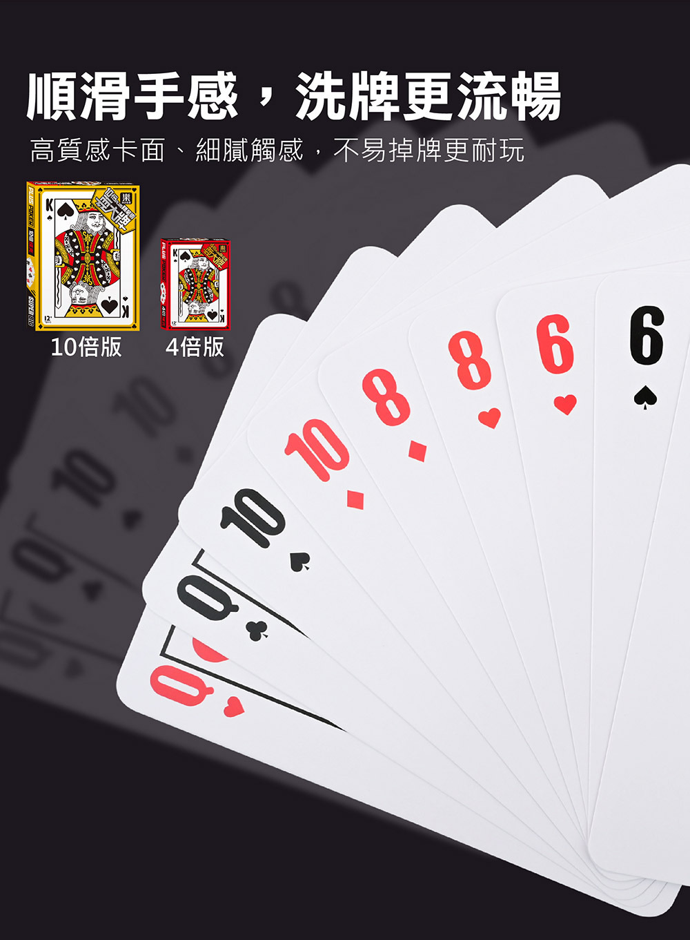 打破常規,讓撲克牌變得前所未有的震撼!「PLUS POKER 巨無霸撲克牌系列」以超大比例設計,提供4倍與10倍兩種超狂尺寸,讓你一拿出來就成為全場焦點。誇張的卡牌尺寸,帶來絕佳的視覺衝擊與趣味體驗,無論是在熱鬧派對、親子活動、露營聚會、校園競賽或戶外表演,都能瞬間炒熱氣氛,成為拍照、開場、互動的最佳道具! 不只放大尺寸,更提升手感與質感。厚磅紙材搭配高彩印刷,細膩的牌面細節讓經典撲克角色更栩栩如生,每一次出牌都充滿戲劇性與參與感。不管你是撲克高手、活動主持人、或只想找個有趣的禮物,這款超大撲克牌絕對是突破無聊日常的神器!和朋友一起重新定義什麼叫「玩牌」,讓每場對局都充滿笑聲與驚喜!